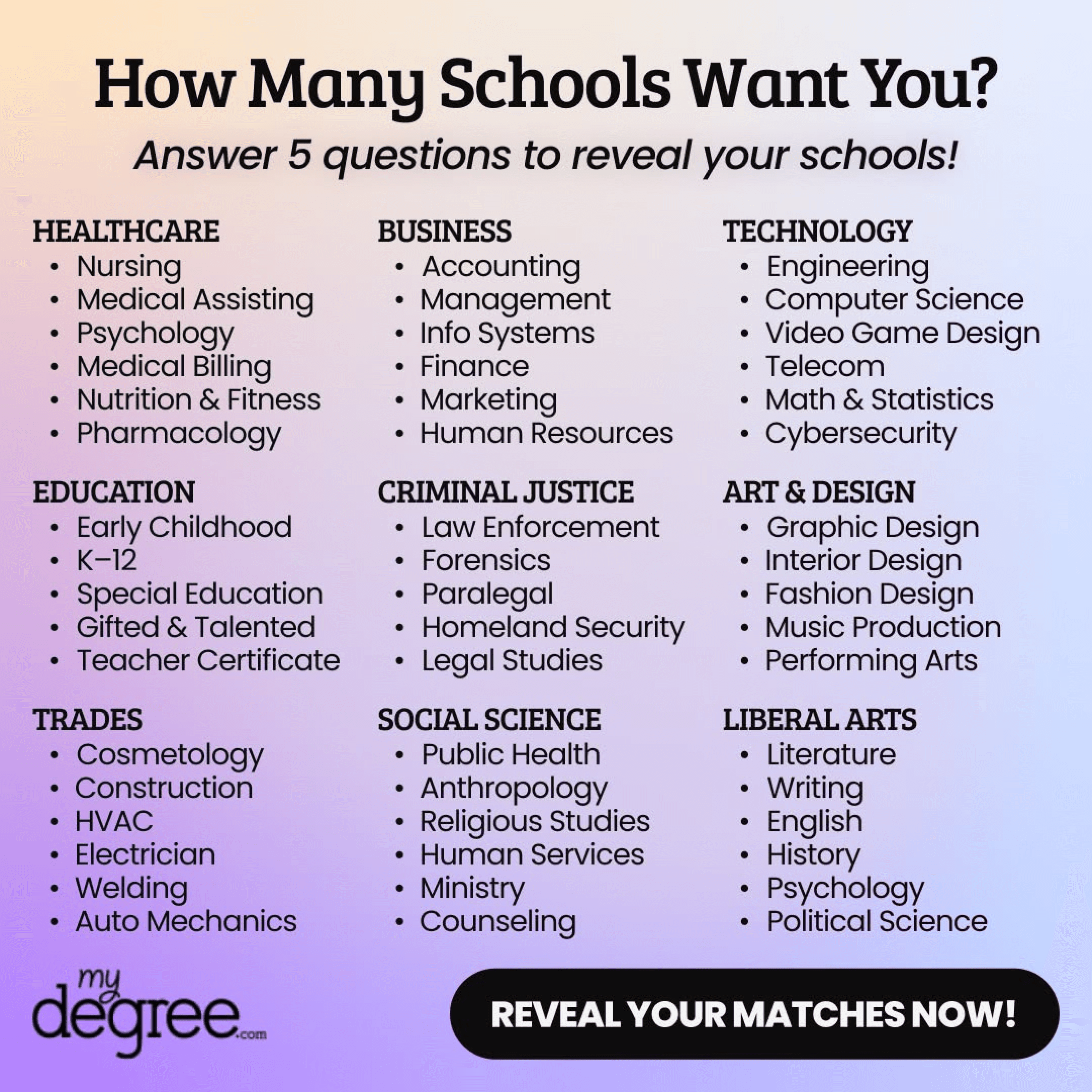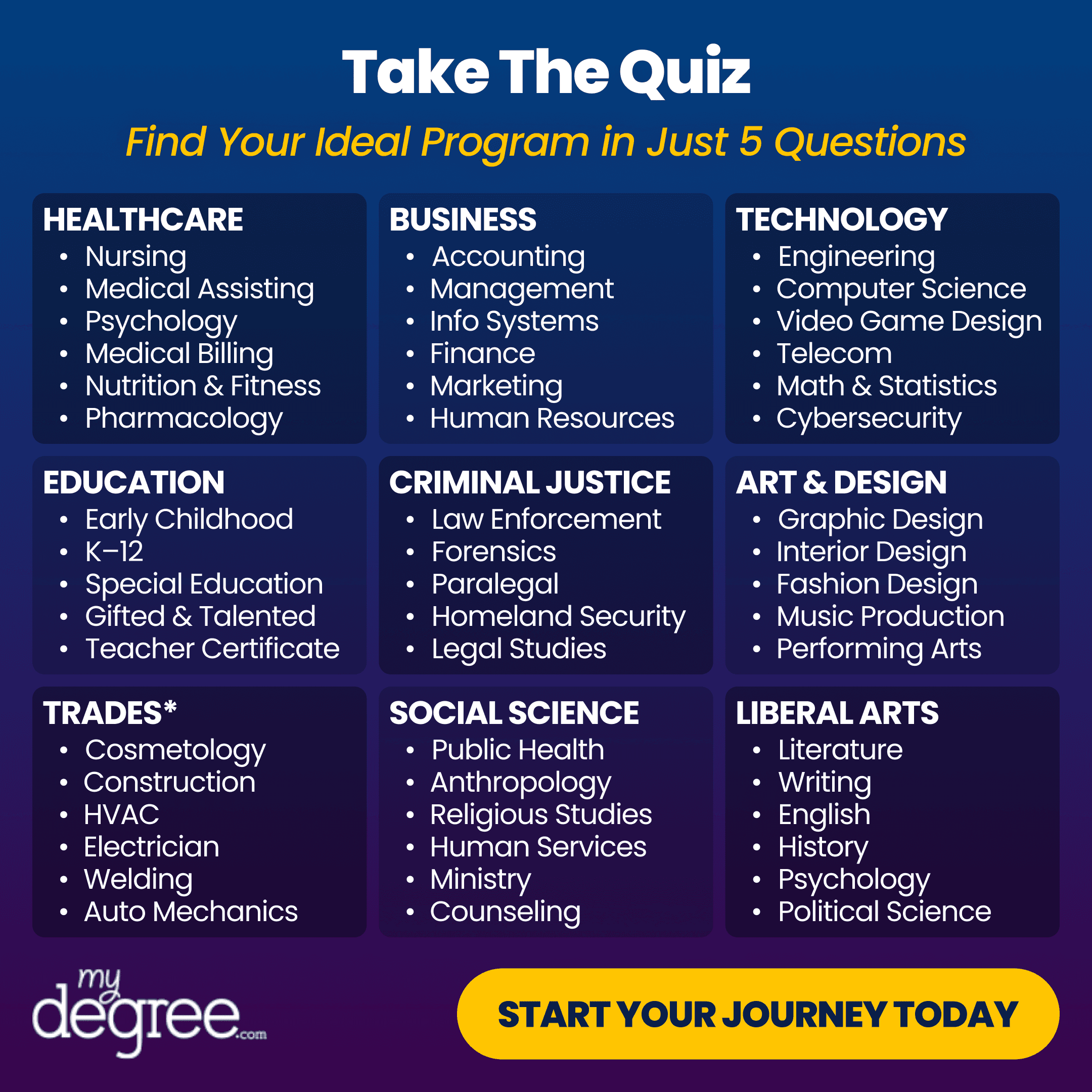 MyDegree connects aspiring students with educational programs tailored to their interests and career goals. Their platform offers program comparisons, financial aid information, and personalized support across fields like healthcare, business, technology, and the arts.