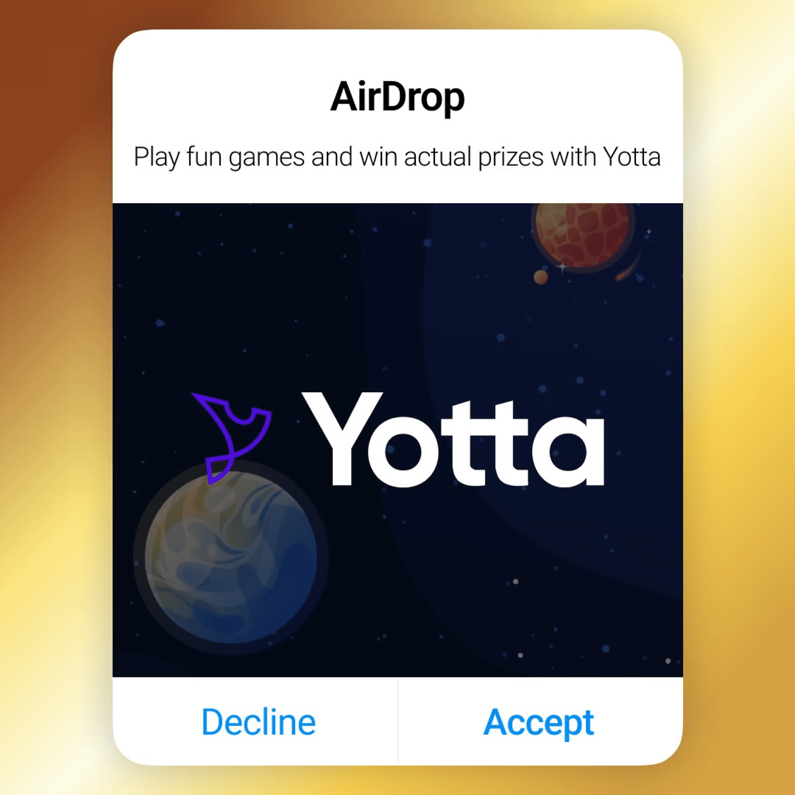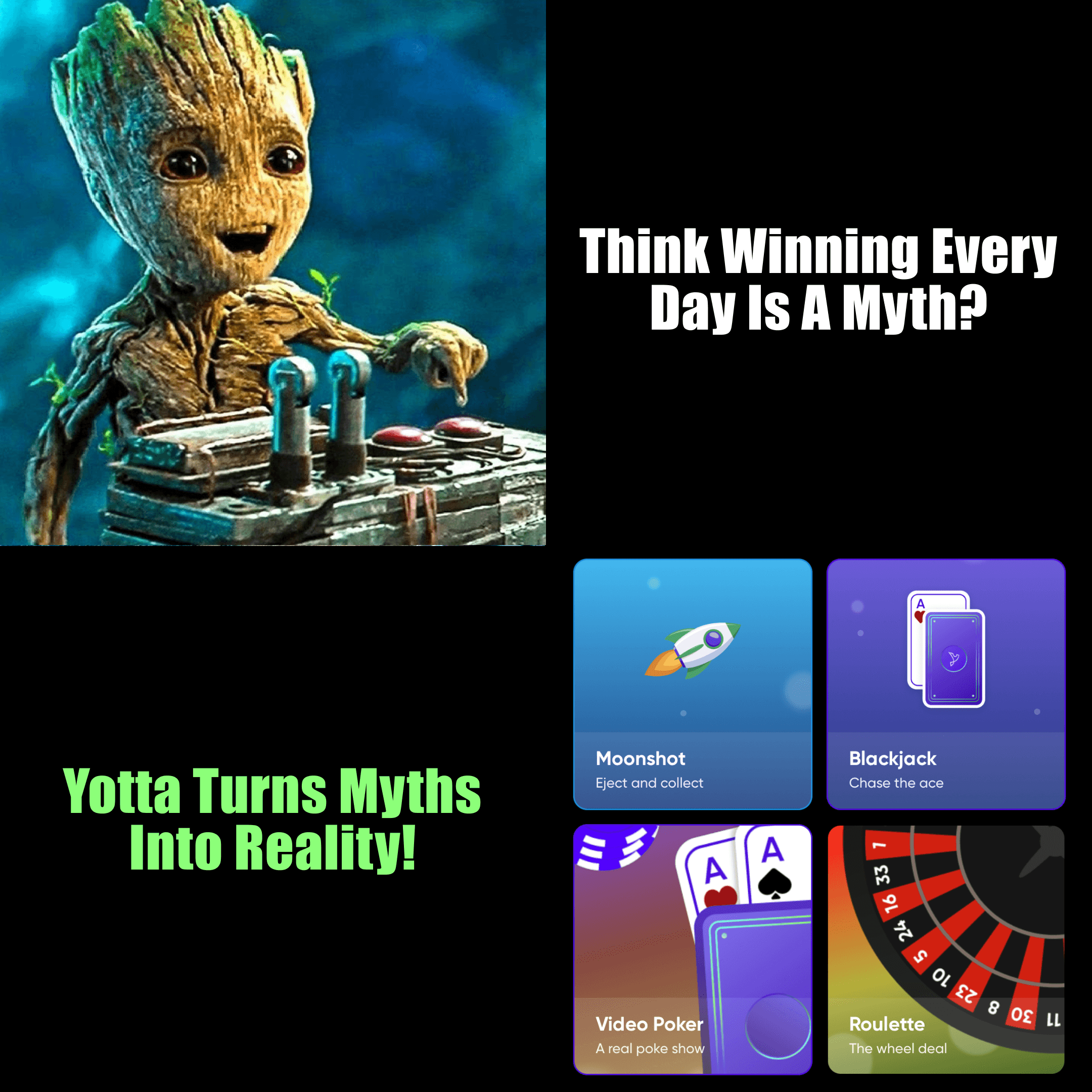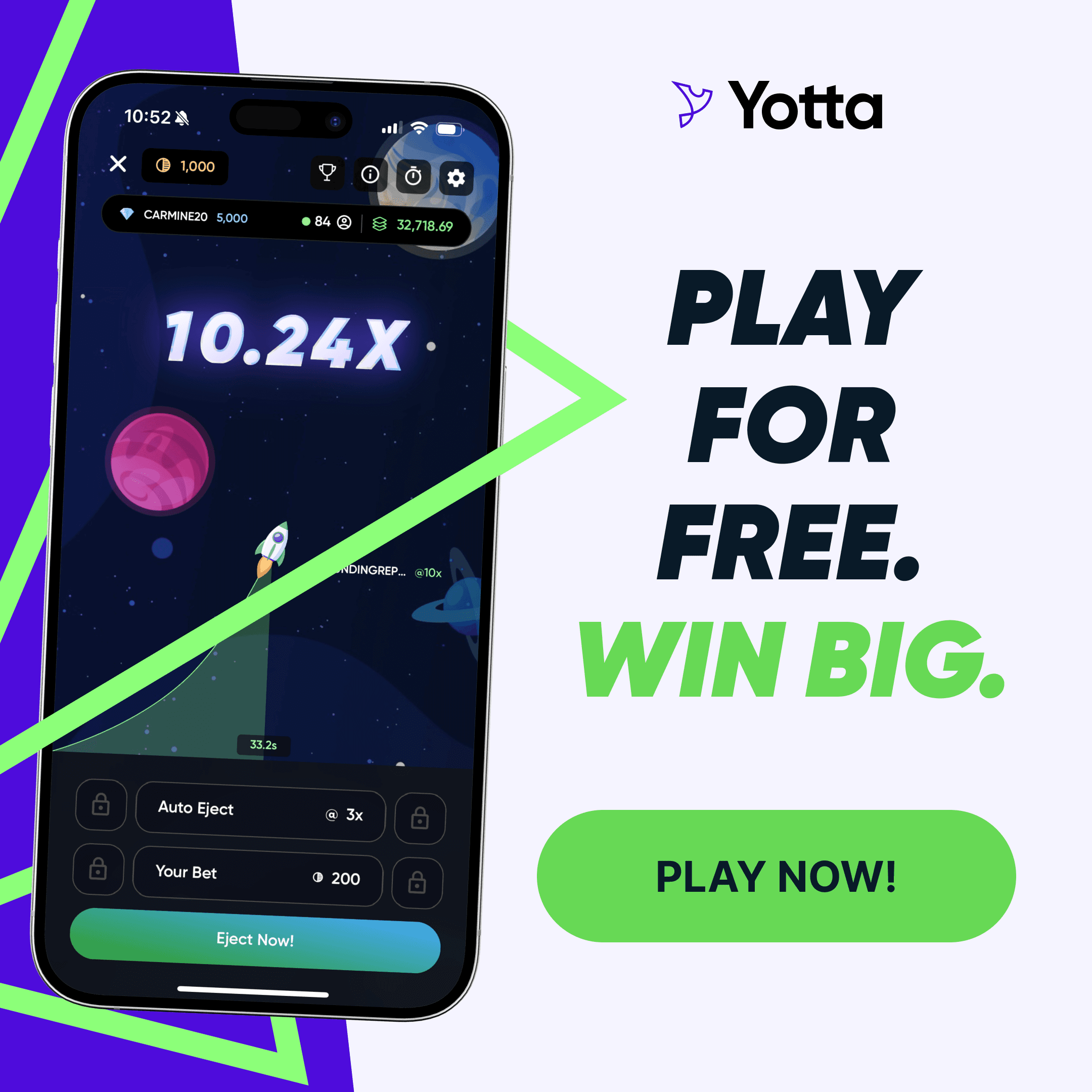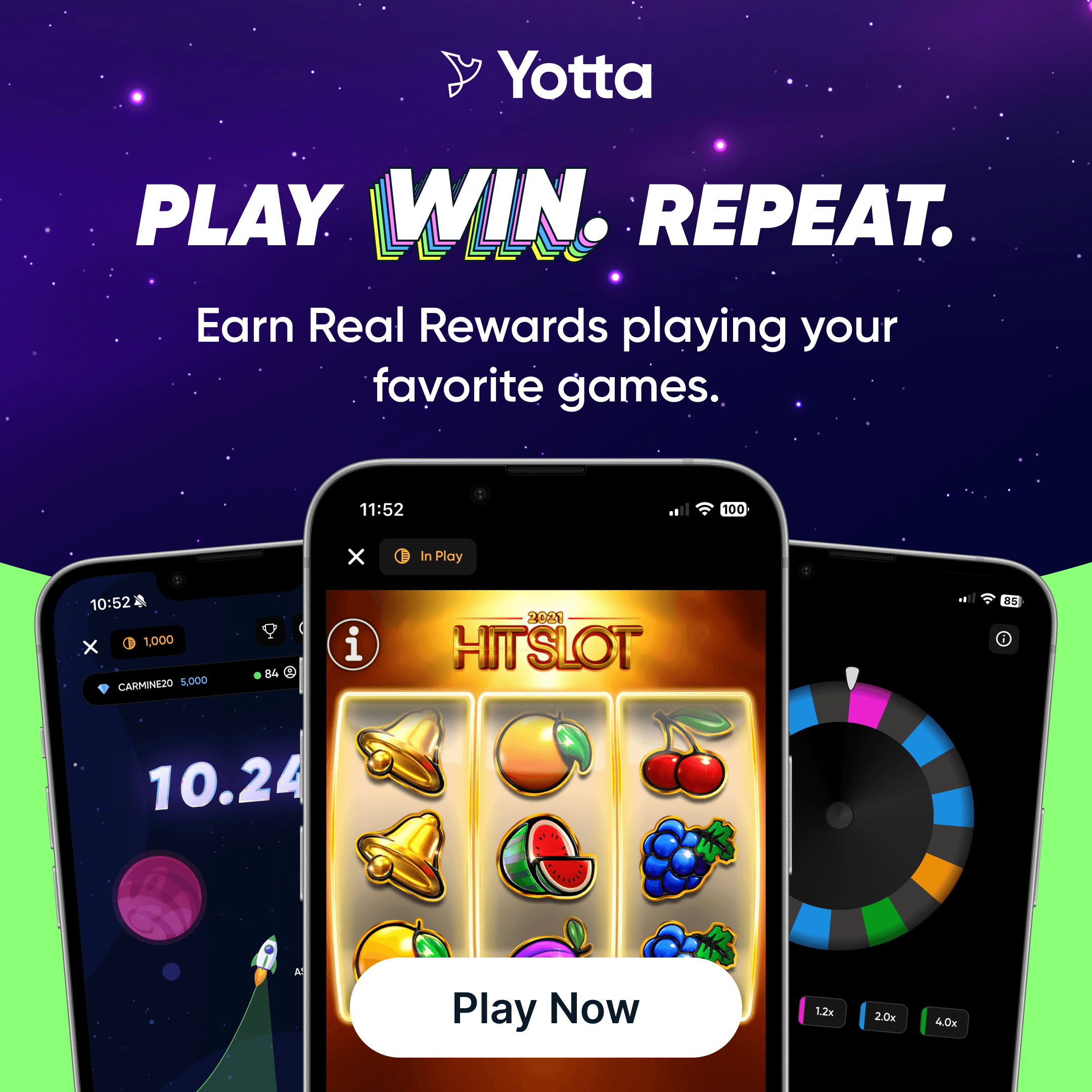 Yotta is a multi-game platform where players can win real prizes through a daily sweepstakes and various games, from unique social experiences like Moonshot and Plinko, to classic casino options. Players use Tokens for free gameplay and can win YottaCash to redeem for real prizes.