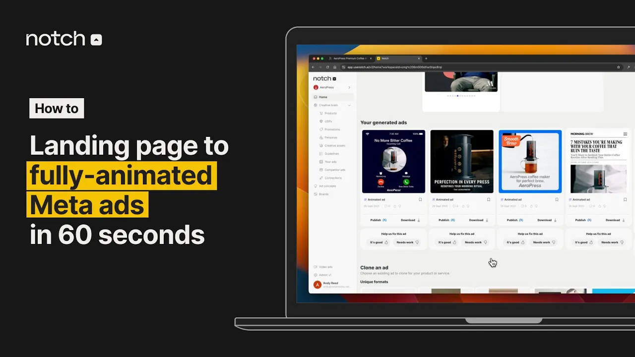 Our AI concept builder analyzes thousands of customer signals to engineer winning ad ideas from scratch. It surfaces fresh USPs, formats, and hooks that haven't been tested in your account yet — but should be.